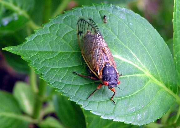 17-Year Locust Scientific Name: Magicicada septendecim, cassini and septendecula (Magicicada means "super" cicada; septendecim and septendecula refer to the 17 year cycle) A large (1.5 in) insect characterized by two compound red eyes and two pairs of transparent orange-veined wings with a black "W" (said to indicate a time of war). Potpourri: Although there are 2,000 species of cicadas worldwide, the periodical cicadas are found only in the United States east of the Great Plains. There are 7 species of periodical cicadas, 4 with a 13 year cycle and 3 with a 17 year cycle. Periodical cicadas emerge in geographical groups known as broods. There are 12 broods of 17-year cicadas and 3 broods of 13-year cicadas. The simultaneous emergence of millions of cicadas overwhelms their predators, assuring the survival of enough egg-laying females. All 3 species of 17-year cicada emerge together. They can be distinguished by their 3 different songs, described as sounding like the word "pharaoh," as a rotary sprinkler and as fat sizzling in a frying pan. The males produce the song with a pair of membranes called tymbals to court females, who respond if impressed with a flick of the wings. The noise is so loud (90 db, like a lawnmower) that the male's ear membranes crease. Soon after mating, the male cicada dies and the female cicada lays 400 to 600 eggs in 40 to 50 different nests consisting of drilled slots in small branches about one half inch in diameter. The egg-laying may result in the death of the branch, known as "flagging." The eggs hatch after about 2 months into ant-size nymphs that fall to the ground and burrow down about 1 foot. The nymphs feed on the sap of the tree's roots at a very slow rate for 17 years, molting 5 times in the process. Although they are full grown at 8 years, they wait until the full 13 or 17 year cycle is up and the soil temperature is 64 degrees F to tunnel out of the ground, climb onto a vertical surface, and metamorphose to an adult. |
