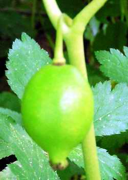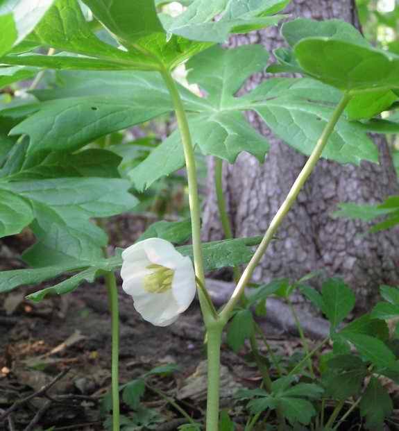 Common Name: Mayapple, Wild Lemon, Mandrake, Umbrella Plant Scientific Name: Podophyllum peltatum (from Greek podos meaning foot, phyllon meaning leaf and pelta meaning shield; all refer to the shape of the leaf)