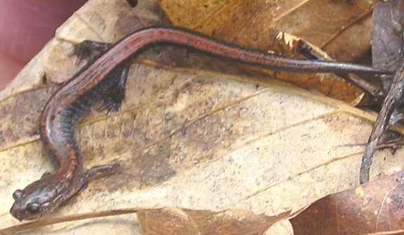 Common Name: Red-backed Salamander Scientific Name: Plethodon cinerus The Red-backed Salamander is characterized by a red stripe extending down the back to the tail, a long and slender body, and protruding eyes. Though it is normally nocturnal, living under the leaf cover during the day, it can be found on the surface on warm days in late winter and early spring. Potpourri: The Red-Backed Salamander is lungless, having evolved to breathe through its skin and membranes in its mouth and throat. The adaptation is believed to have evolved as stream-dwelling salamanders needed reduced buoyancy to keep from being washed downstream by the currents. Salamanders are quite plentiful. One study found that their biomass exceeded that of small mammals and was double that of birds during the peak breeding season. Red-backed Salamanders made up about 94 per cent of the total salamander biomass. The reason for this is that they have evolved to tolerate the cold better than other salamanders. Red-backed Salamanders are terrestrial. The female lays 6-12 eggs in a grape-like cluster under a stone or in a rotten log, staying curled around them for protection for two months. The name salamander means "lives in fire" and derives from a mythological reptile in Persian lore that was said to live in fire. It is generally used for any of various devices used in fire and able to resist heat, such as pokers and portable ovens. |
