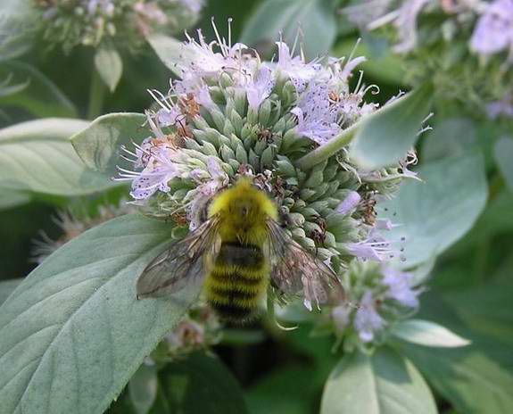 Bumblebees are in the order Hymenoptera along with the ants, wasps and in the family Apidae with the other bees (Apis is Latin for bee). The hymenopterans are among the most prolific of insects groupings with more than 100,000 species. They are named for their most common characteristic, membranous wings for the Greek hymen meaning membrane and ptero meaning wings, or, since Hymen is also the Greek god of marriage, the name could refer to the fact that the two wings on each side of the bees and the wasps are linked together with small hooks called hamuli so that they operate in harmony. There is no universal characteristic of hymenopterans, though they for the most part have diaphanous wings, chitinous exoskeletons and a narrow waist between the thorax and the abdomen. The specialization of the hymenopterans (bees, wasps and ants) is clearly of benefit to the colony but it is not necessarily of benefit to the individual, is referred to as eusociality, the highest level of social organization. It is characterized by reproductive division of labor (the queen), overlapping generations, and mutual care of the young. Bumblebees are considered weakly eusocial because the female workers can and do produce male offspring, though they are discouraged by the queen through a combination of aggression and pheromones. . |